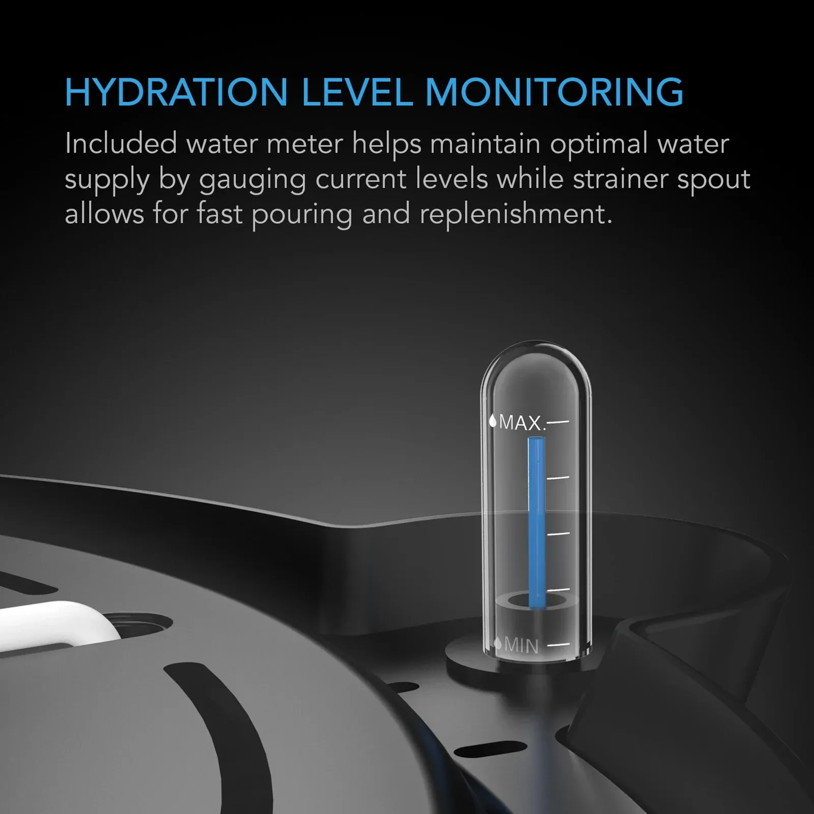 A water gauge is included to display current levels in the reservoir, while the strainer spout on the other end enables quick pouring and replenishing.